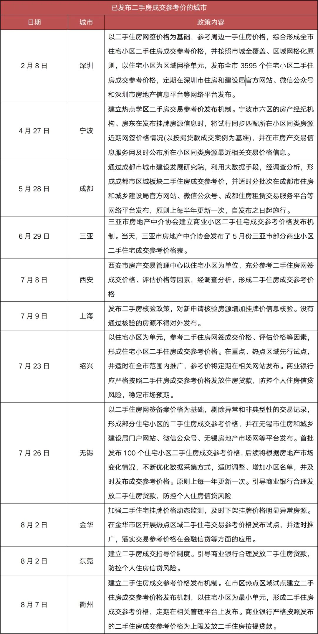 自7月23日住建部8部門發(fā)文以來,跟進升級調控的城市中,紹興、金華、東莞、衢州明確了建立二手住房成交參考價格發(fā)布機制,商業(yè)銀行嚴格按照發(fā)布的二手住房成交參考價格為上限發(fā)放二手住房按揭貸款。