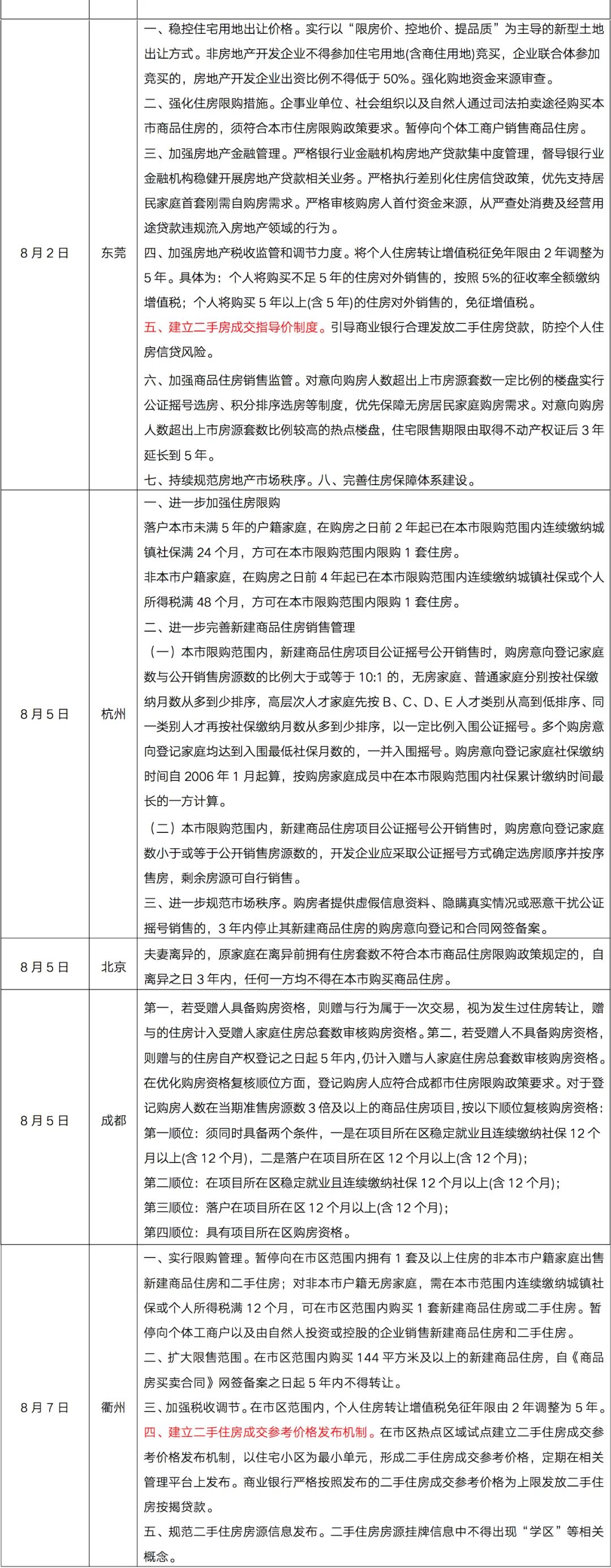 在此之前金華、東莞、衢州等城市分別從加強限購、限售以及二手房參考價等多角度“打補丁”,其中東莞的“莞八條”更是被認為“史上最嚴”,調控力度比肩一線城市。而浙江衢州更是在20天內連發(fā)兩次調控,并加入二手房成交參考價格發(fā)布機制。
