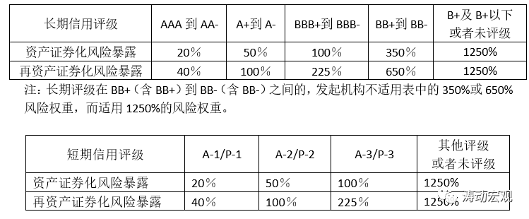(1)2012年6月7日,銀監(jiān)會(huì)發(fā)布《商業(yè)銀行資本管理辦法(試行)》,明確商業(yè)銀行擁有的債務(wù)工具擁有合格外部評(píng)級(jí)機(jī)構(gòu)提供的債項(xiàng)評(píng)級(jí)結(jié)果的,則該債務(wù)工具的風(fēng)險(xiǎn)權(quán)重將根據(jù)其外部評(píng)級(jí)來確定。以商業(yè)銀行持有的資產(chǎn)證券化產(chǎn)品為例,相應(yīng)的外部評(píng)級(jí)與對(duì)應(yīng)的風(fēng)險(xiǎn)權(quán)重如下: