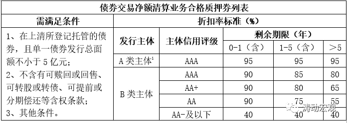 (1)2016年8月24日,上清所發(fā)布的《債券交易凈額清算業(yè)務(wù)質(zhì)押式回購質(zhì)押券管理規(guī)程》明確上清所負(fù)責(zé)設(shè)定可納入通用質(zhì)押券業(yè)務(wù)的合資格債券標(biāo)準(zhǔn),合資格債券折扣率根據(jù)主體信用水平、債券剩余期限、價(jià)格波動(dòng)和市場(chǎng)流動(dòng)性等設(shè)定。其中,質(zhì)押券價(jià)值=債券總面額累計(jì)*全價(jià)估值*折扣率/百元剩余本金。