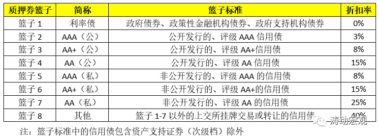 (3)2018年4月24日,上交所與中國清算聯(lián)合發(fā)布《債券質(zhì)押式三方回購交易及結(jié)算暫行辦法》,明確三方回購的正回購方限于金融機(jī)構(gòu)、公募證券投資基金和商業(yè)銀行的理財(cái)產(chǎn)品。同時(shí)在業(yè)務(wù)開展初期,擔(dān)保品按債券類型、發(fā)行方式和債券評(píng)級(jí)劃分為8個(gè)質(zhì)押券籃子,具體劃分標(biāo)準(zhǔn)及折扣率如下: