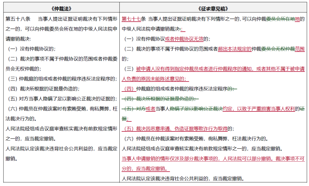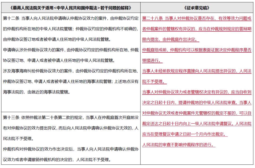 對比《最高人民法院關于適用<中華人民共和國仲裁法>若干問題的解釋》(“《仲裁司法解釋》”)和《征求意見稿》就可以發現, 《征求意見稿》對現行制度的修改包括: