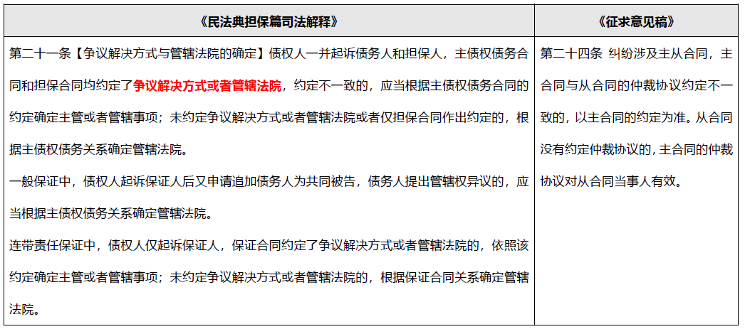“從隨主走”是從《擔保法》時期就開始的司法實踐, 但該等司法實踐當初僅局限于法院訴訟的管轄條款, 并不及于仲裁條款, 導致主從合同約定的爭議解決方式不同、約定的仲裁機構不一致的情況下, 債權人很可能需要經多個程序, 才能實現其債權及其擔保物權, 在浪費大量司法資源的同時, 也使得債權人產生了很大的訴訟費、仲裁費支出。進入《民法典》時代后, 最高院頒布《最高人民法院關于適用<中華人民共和國民法典>擔保部分的解釋》(“《民法典擔保篇司法解釋》”)將“從隨主走”的適用范圍拓寬至“爭議解決方式或者管轄法院”, 但是我們仔細比較《民法典擔保篇司法解釋》第二十一條和《征求意見稿》第二十四條的規定卻發現兩者存在一定沖突。