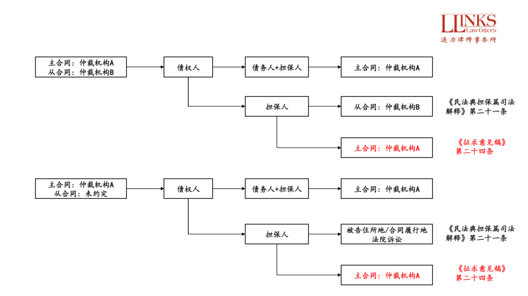 雖然同樣是“從隨主走”, 《民法典擔保篇司法解釋》其實區分了兩種不同的情形, 即同時起訴債務人和擔保人和僅起訴保證人, “從隨主走”的原則僅適用于同時起訴債權人和擔保人的情況, 如果僅起訴保證人, 仍然需要根據保證合同約定的爭議解決方式確定主管和管轄事項。但《征求意見稿》卻并沒有作上述兩種情況的區分, 即只要主合同約定了仲裁條款, 哪怕是僅對保證人提起仲裁, 仍然需要按照主合同的仲裁條款確定管轄。這就導致了在僅起訴保證人的情況下, 兩者對于案件的管轄問題會給出截然不同的結論: