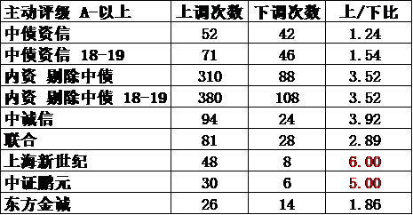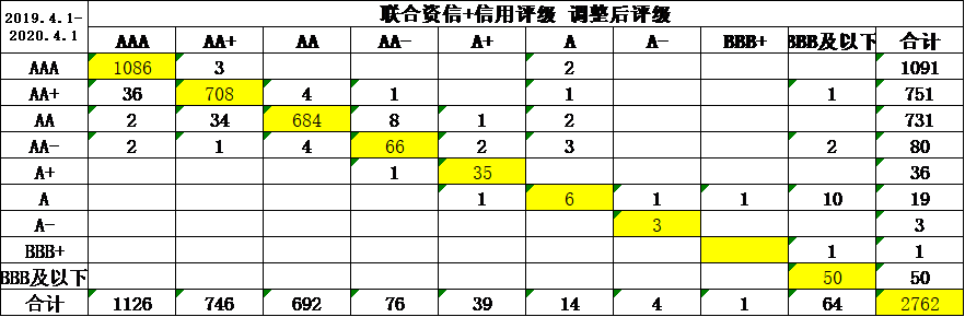 根據(jù)財匯金融大數(shù)據(jù)終端下載的主體評級遷移矩陣,中債資信在2018年4月1日至2019年4月1日,上調(diào)71次,下調(diào)46次,上調(diào)/下調(diào)比1.54;在2019年4月1日至2020年4月1日,上調(diào)52次,下調(diào)42次,上調(diào)/下調(diào)比1.24,比例沒有太夸張,并呈現(xiàn)收窄趨勢,風(fēng)險偏好相對謹慎,還算能用。
