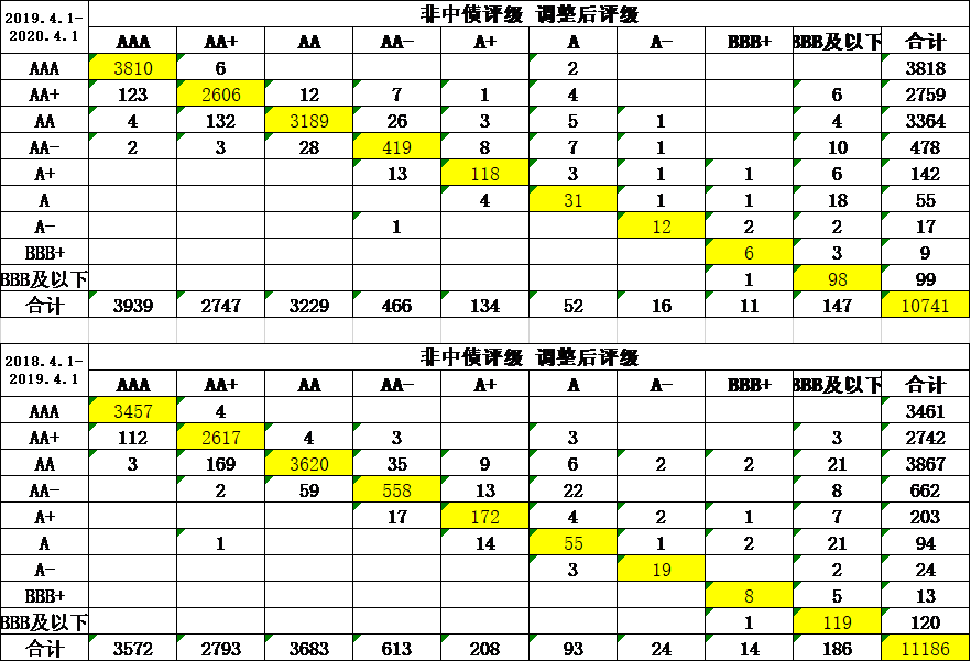 以下是各家評級公司的評級主體遷移矩陣數(shù)據(jù),沒算大公,畢竟剛放出來沒多久。