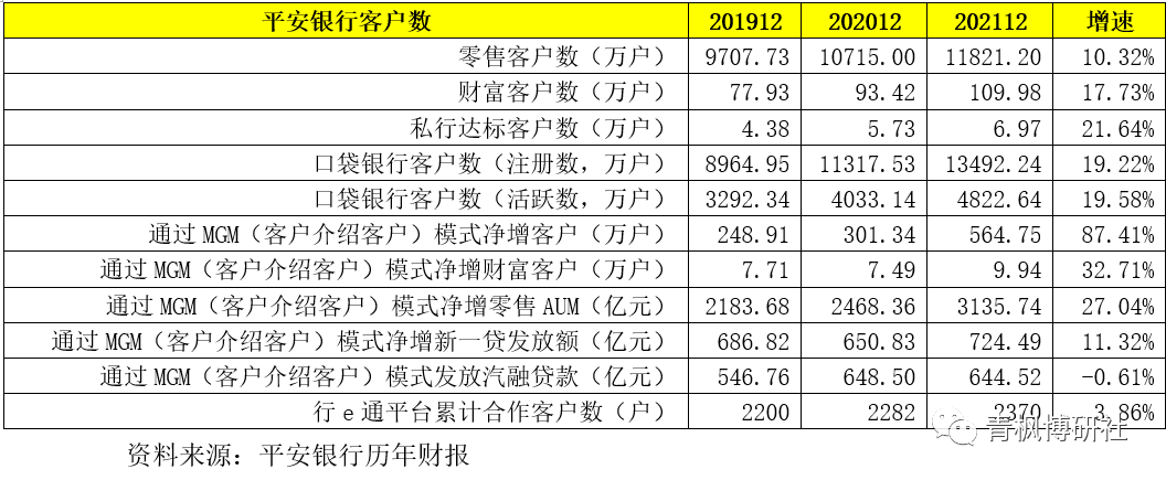 1、平安銀行財報中披露的客戶數指標包括但不限于零售客戶數、財富客戶數、私行客戶數、口袋銀行客戶數(注冊數與活躍數)、通過MGM模式凈增零售客戶數與財富客戶數、汽車金融客群月活躍用戶數、平安好鏈平臺上線客戶數(對公供應鏈金融)、數字口袋APP累計注冊企業客戶數、、開放平臺服務客戶數、行e通平臺累計合作客戶數(同業平臺)等等。