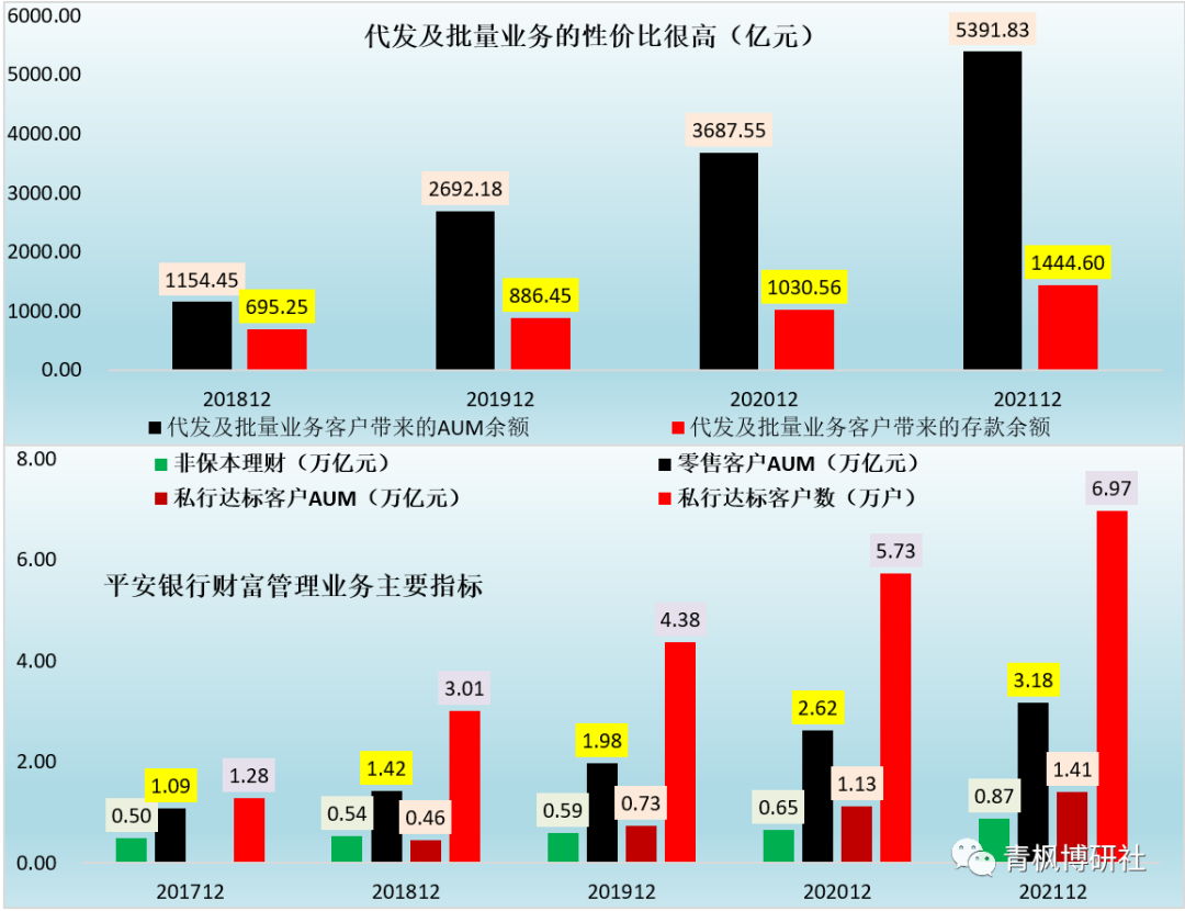 零售AUM與私行達標客戶AUM(即近三月任意一月的日均資產超過600萬元)是平安銀行最為倚重的兩個指標。截至2021年12月底,