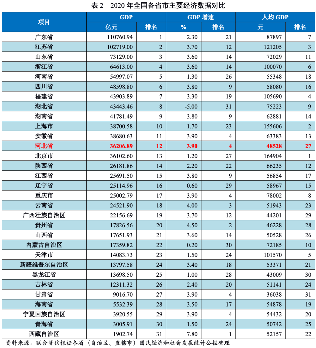 河北省經(jīng)濟(jì)發(fā)展基礎(chǔ)較好,經(jīng)濟(jì)總量在全國排名中游,但人均地區(qū)生產(chǎn)總值在全國排名靠后。受鋼鐵、煤炭、石化等傳統(tǒng)支柱產(chǎn)業(yè)化解過剩產(chǎn)能及節(jié)能減排等政策影響,經(jīng)濟(jì)增長面臨一定壓力。2021年前三季度,河北省各主要經(jīng)濟(jì)指標(biāo)保持增長,但增速不及全國平均水平。