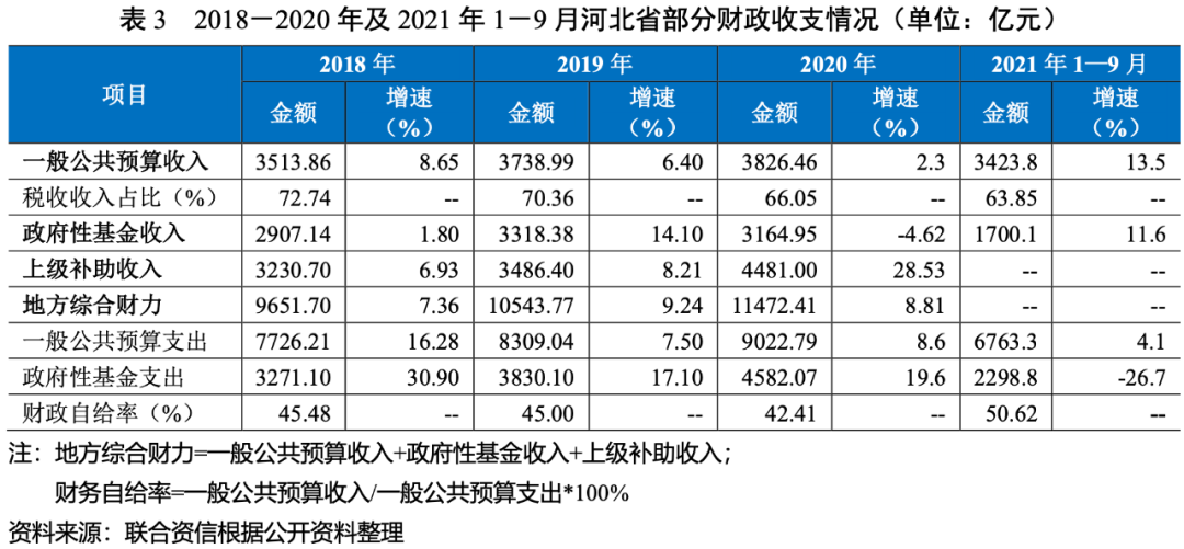 河北省經(jīng)濟(jì)總量在全國排名中游,受供給側(cè)結(jié)構(gòu)性改革影響,近年來經(jīng)濟(jì)增長速度承壓,人均GDP在全國排名靠后。2021年前三季度,河北省各主要經(jīng)濟(jì)指標(biāo)保持增長,但增速不及全國平均水平。由于加大產(chǎn)業(yè)轉(zhuǎn)型升級、進(jìn)一步落實去產(chǎn)能任務(wù)、促進(jìn)戰(zhàn)略性新興產(chǎn)業(yè)發(fā)展,河北省政府債務(wù)余額快速增長。河北省政府負(fù)債率和債務(wù)率在全國排名中游,償債能力較強。