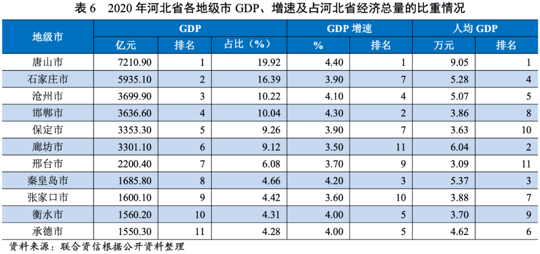 從GDP增速看,2020年河北省各地級市GDP增速均介于3.5%~4.5%之間,差距不大。各地級市人均GDP差異較大,其中最高為唐山市,其后依次為廊坊市、秦皇島市、石家莊市、滄州市和承德市,人均GDP在4.50~6.10萬元之間,剩余地級市人均GDP均在4.00萬元以下,邢臺市人均GDP水平最低,僅為3.09萬元。