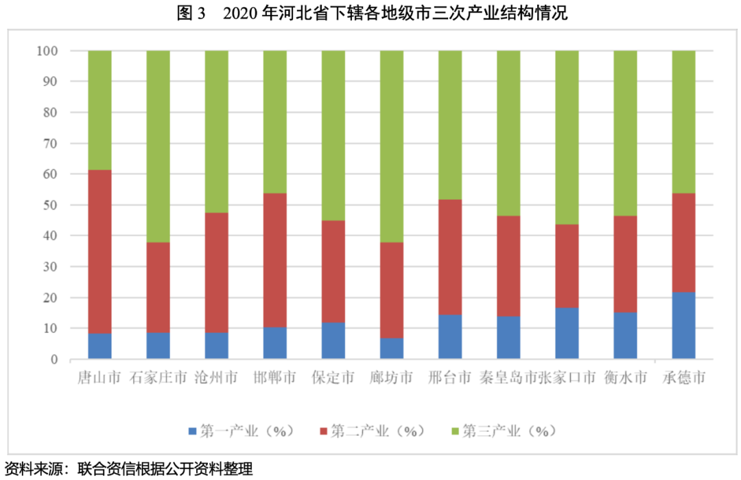 河北省下轄各地級市經(jīng)濟(jì)發(fā)展較不均衡,形成三級梯隊格局,各梯隊之間差異較大,其中唐山市和石家莊市經(jīng)濟(jì)體量較大。2020年,雖受疫情和經(jīng)濟(jì)下行的影響,各地級市經(jīng)濟(jì)仍保持正增長。2021年1-9月,隨著各地級市從疫情中逐步恢復(fù),各地級市GDP增速較上年同期有較大提升。受益于京津冀協(xié)同發(fā)展,廊坊市人口流入規(guī)模顯著高于其他地級市,各地級市均步入老齡化社會。河北省下轄各地市第三產(chǎn)業(yè)均保持較快發(fā)展,但產(chǎn)業(yè)結(jié)構(gòu)區(qū)別較大。2020年,石家莊市和廊坊市第三產(chǎn)業(yè)比重較高,唐山市是河北省唯一一個經(jīng)濟(jì)結(jié)構(gòu)以工業(yè)為主的地級市。