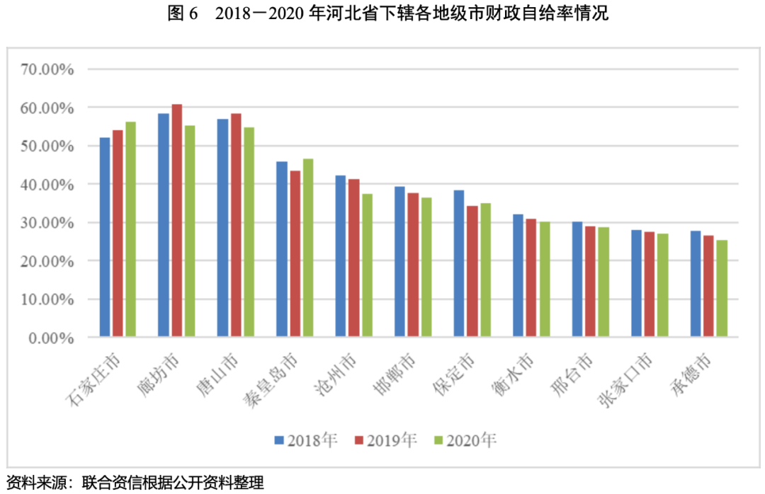 財政自給能力方面,2020年,除石家莊市、秦皇島市和保定市外,河北省其他各地級市財政自給率均較上年有所下降,其中廊坊市財政自給率降幅較大;除石家莊市、廊坊市和唐山市外,其他各地級市財政自給率均在50%以下,整體財政自給能力偏弱。