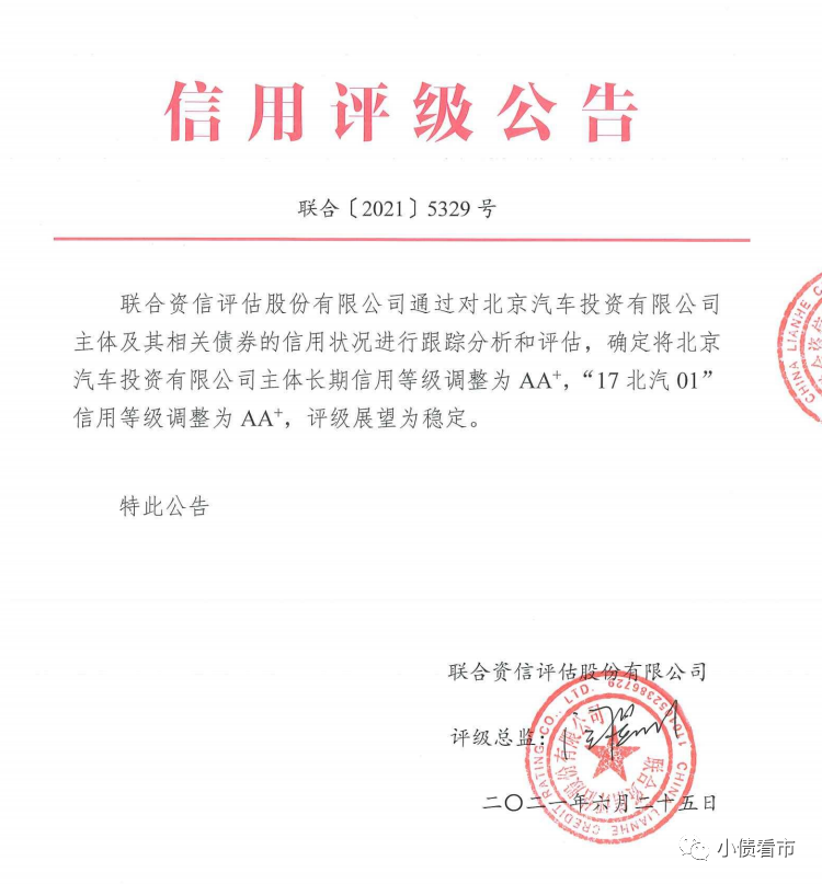 6月28日,聯(lián)合資信公告稱,確定將北京汽車投資有限公司(以下簡稱“北汽投資”)主體長期信用等級調(diào)整為AA+,“17北汽01”的信用等級為AA+,評級展望為穩(wěn)定。