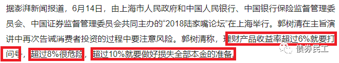 單純的從非標市場來看,投資者是市場上的稀缺資源,是各類金融機構(gòu)爭取的優(yōu)質(zhì)客戶。從現(xiàn)有的公開信息來看,金融機構(gòu)是實際上很難履行投資者教育相關(guān)工作,讓投資者充分認識到金融產(chǎn)品可能存在的風險和問題。因此,投資者對于非標產(chǎn)品“買者自負”的可能并未達到監(jiān)管的要求。這里我們再重溫一下郭主席的講話“理財產(chǎn)品收益率超過6%就要打問號,超過8%很危險,超過10%就要做好損失全部本金的準備”。