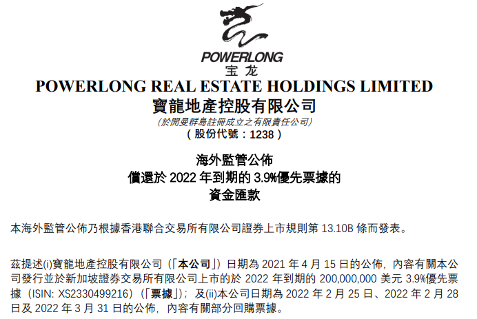 2022年4月初,杠桿地產注意到,寶龍地產曾發布一則公告,“海外監管公布償還于2022年到期的3.9%優先票據的資金匯款”。