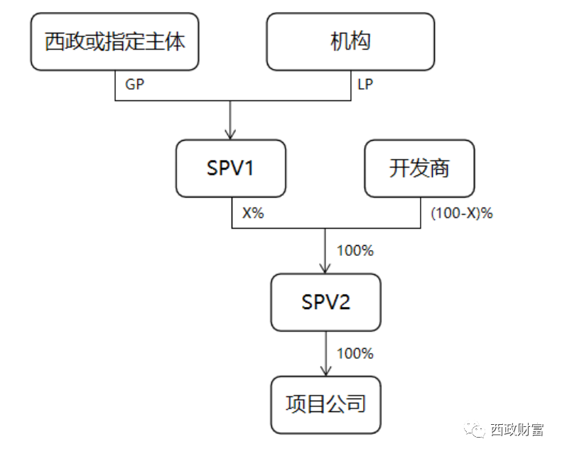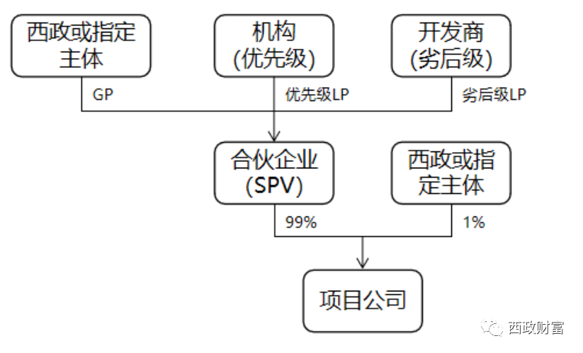 1. 由西政或指定主體擔(dān)任GP,機(jī)構(gòu)優(yōu)先級LP、開發(fā)商劣后級LP共同設(shè)立合伙企業(yè)(SPV),西政或指定主體與SPV設(shè)立項(xiàng)目公司(因合伙企業(yè)不得100%持有有限公司的股權(quán),因此1%的股權(quán)實(shí)際為代持性質(zhì))。