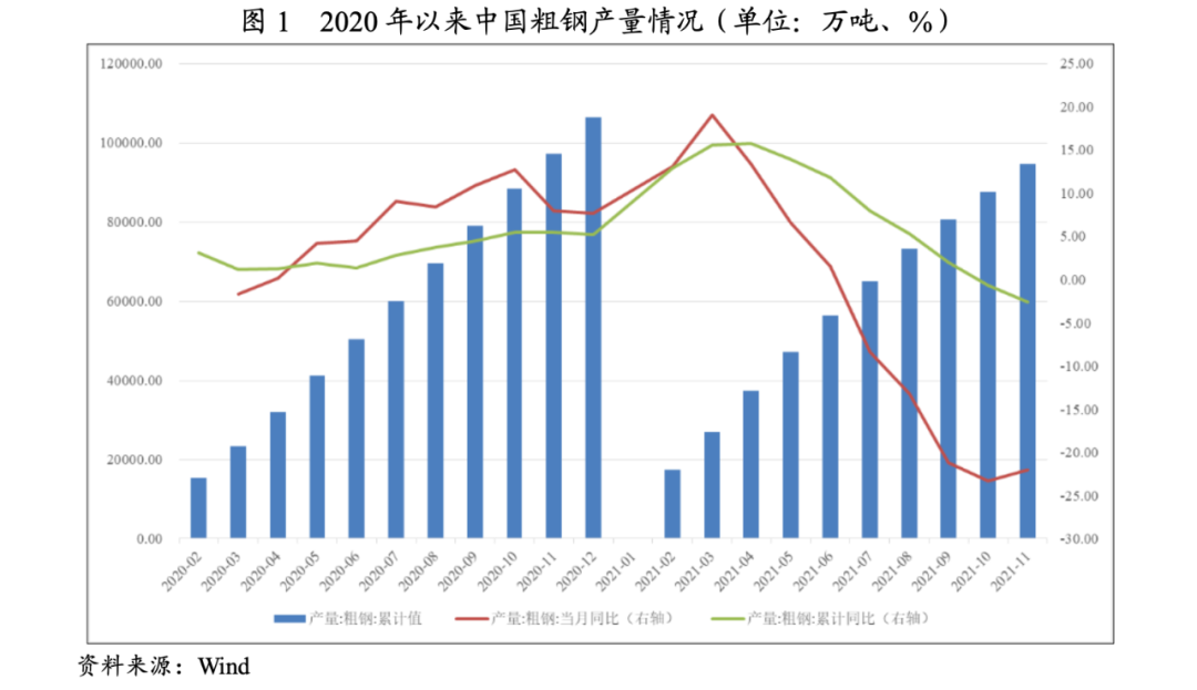 2021年1―11月,中國(guó)生鐵、粗鋼和鋼材產(chǎn)量分別為79623萬(wàn)噸、94636萬(wàn)噸和122333萬(wàn)噸,同比分別下降4.20%、下降2.60%和增長(zhǎng)1.00%。從月度走勢(shì)看,自2021年4月開始月度粗鋼產(chǎn)量增速有所放緩,7月起月度粗鋼產(chǎn)量同比增速由正轉(zhuǎn)負(fù),且降幅不斷擴(kuò)大,主要系下游需求轉(zhuǎn)弱以及限產(chǎn)施壓所致。