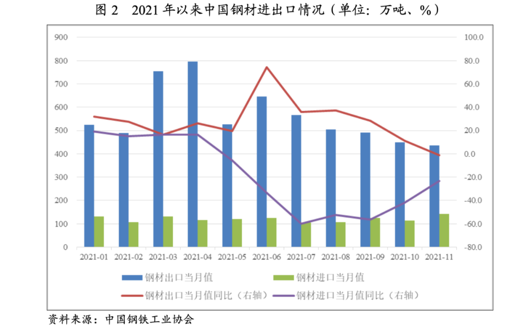 進(jìn)出口方面,2021年1―11月,中國(guó)累計(jì)出口鋼材6187.5萬(wàn)噸,同比增長(zhǎng)26.7%,月度出口量呈現(xiàn)沖高回落態(tài)勢(shì)。其中,5月份環(huán)比大幅下降主要系5月1日起國(guó)家取消部分鋼材退稅政策以及國(guó)內(nèi)外鋼材價(jià)差縮小所致。同期,中國(guó)累計(jì)進(jìn)口鋼材1326.7萬(wàn)噸,同比下降29.6%,月度進(jìn)口量環(huán)比變動(dòng)不大。