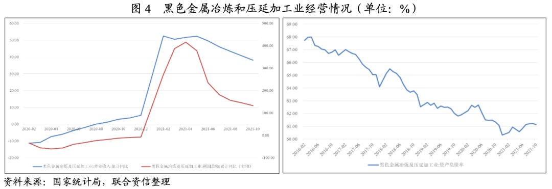 2021年以來,受政策調(diào)控影響,月度粗鋼產(chǎn)量呈現(xiàn)先增后降趨勢(shì),1―11月累計(jì)粗鋼產(chǎn)量出現(xiàn)同比下降,預(yù)計(jì)全年可實(shí)現(xiàn)減產(chǎn)目標(biāo);鋼材價(jià)格先升后降,整體處于歷史高位,行業(yè)效益大幅上升,資產(chǎn)負(fù)債率處于歷史較低水平。