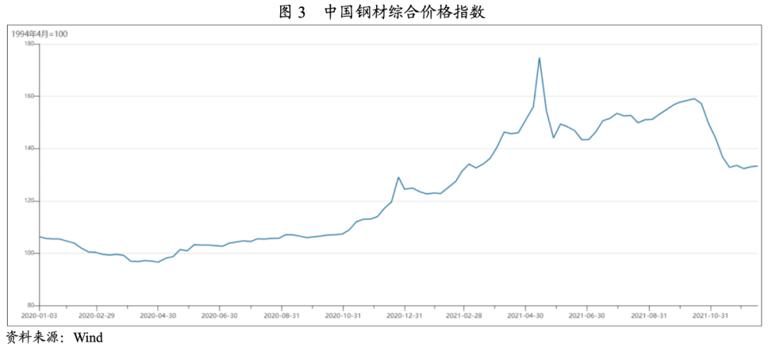 價(jià)格方面,2021年以來鋼材價(jià)格呈現(xiàn)先升后降、大幅波動(dòng)態(tài)勢(shì),但整體處于歷史高位。具體來看,2021年一季度受通脹預(yù)期以及成本抬升影響,鋼材價(jià)格開啟上漲趨勢(shì);二季度,河北等地環(huán)保限產(chǎn),同時(shí)疊加下游用鋼需求和投機(jī)需求旺盛,供需緊張推動(dòng)鋼材價(jià)格持續(xù)上漲,并于5月漲至歷史高點(diǎn);此后,隨著國(guó)家出臺(tái)了一系列調(diào)控政策以及下游需求放緩,鋼材價(jià)格有所回落,但由于原材料焦炭?jī)r(jià)格快速攀升至歷史高位,對(duì)鋼材價(jià)格形成一定支撐;10月底以來,焦炭?jī)r(jià)格在政府干預(yù)下明顯下降,同時(shí)疊加用鋼需求下降,鋼材價(jià)格大幅回落,但仍高于去年同期水平。