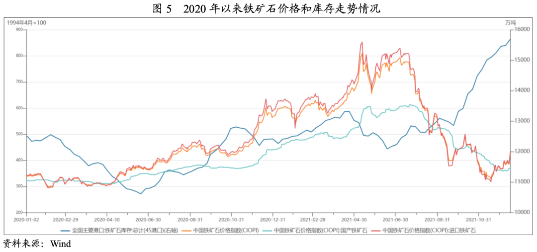 2021年以來,鐵礦石和焦炭?jī)r(jià)格波動(dòng)明顯,且整體處于較高水平,不利于鋼鐵企業(yè)成本控制;下游鋼材表觀消費(fèi)量先增后降,建筑業(yè)和制造業(yè)用鋼需求有所分化。