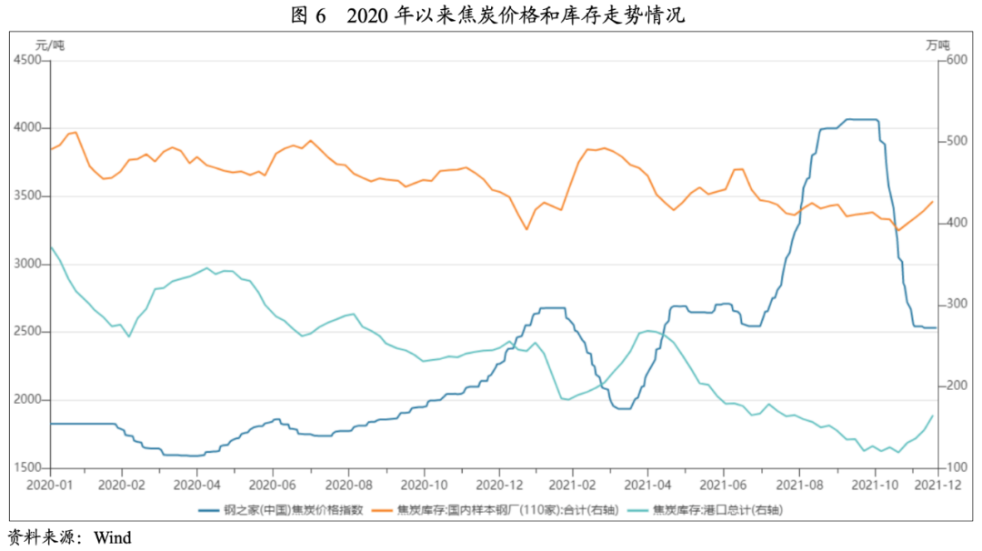 焦炭是支撐鋼鐵生產(chǎn)的基本原材料,中國(guó)鋼鐵行業(yè)焦炭供給主要來自國(guó)內(nèi)煤炭企業(yè)。2021年上半年,煤炭生產(chǎn)受“雙碳”政策、環(huán)保要求、安全事故等多因素影響,焦炭供需出現(xiàn)錯(cuò)配,焦炭?jī)r(jià)格波動(dòng)較大。其中,3―4月,由于新焦?fàn)t陸續(xù)投產(chǎn),加之河北地區(qū)鋼鐵限產(chǎn),焦炭?jī)r(jià)格快速下跌。之后,環(huán)保限產(chǎn)、能耗雙控、焦煤進(jìn)口受限等因素影響焦炭企業(yè)產(chǎn)量釋放,焦炭?jī)r(jià)格大幅上漲。但10月底以來,煤炭保供政策持續(xù)發(fā)力,焦炭庫(kù)存止跌反升,焦炭?jī)r(jià)格高位回落,但仍處于歷史較高水平。