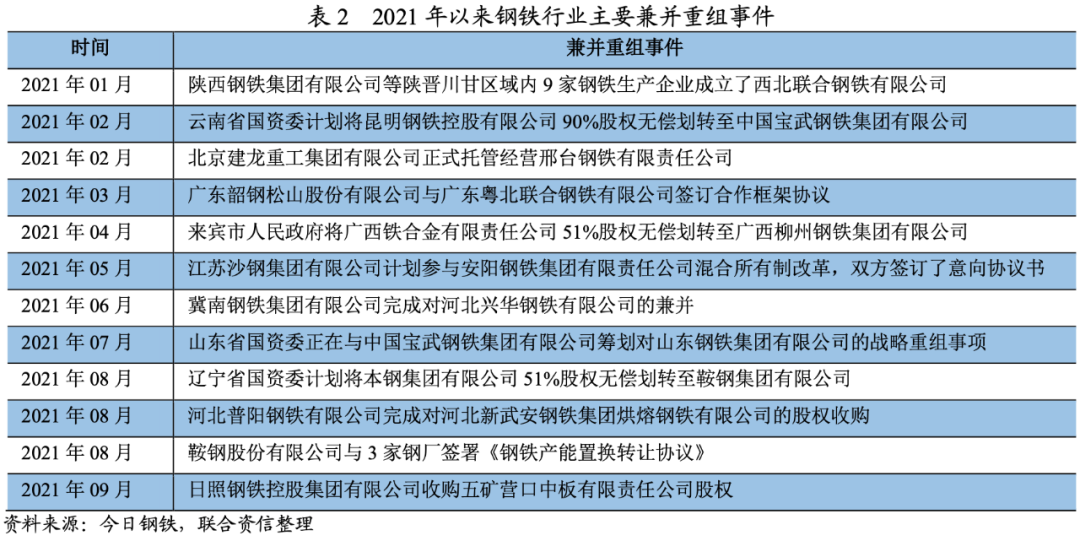 中國(guó)鋼鐵生產(chǎn)和消費(fèi)有區(qū)域性特征,區(qū)域整合是鋼鐵行業(yè)實(shí)現(xiàn)結(jié)構(gòu)優(yōu)化和集中度提升的基礎(chǔ),2021年以來鋼鐵企業(yè)兼并重組的步伐明顯加快。其中,鞍鋼集團(tuán)有限公司重組本鋼集團(tuán)有限公司,以6300萬(wàn)噸/年的粗鋼產(chǎn)能成為國(guó)內(nèi)第二大鋼企;中國(guó)寶武鋼鐵集團(tuán)有限公司擬重組山東鋼鐵集團(tuán)有限公司,產(chǎn)能規(guī)模將增至1.5億噸/年。在龍頭企業(yè)全國(guó)化布局的同時(shí),不少中小型鋼鐵企業(yè)的兼并重組也動(dòng)作頻頻。國(guó)內(nèi)鋼鐵企業(yè)數(shù)量眾多,產(chǎn)能規(guī)模的差距也非常大,行業(yè)要形成有序的競(jìng)爭(zhēng)格局,僅僅依靠龍頭企業(yè)的兼并重組還不夠,區(qū)域性小企業(yè)的整合也是必經(jīng)之路。