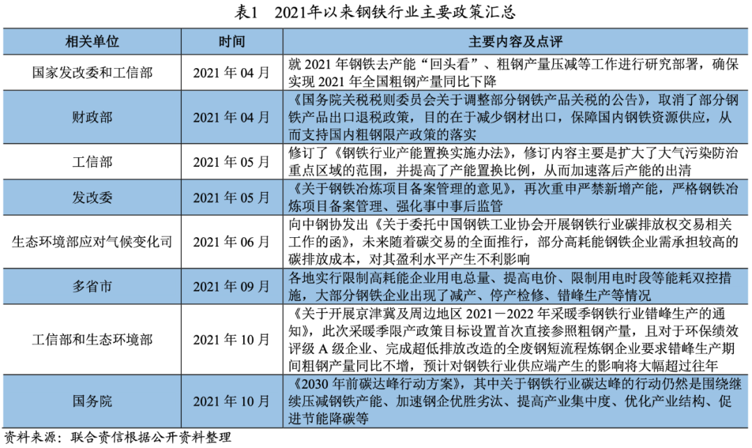 2021年是“雙碳”政策調(diào)控的元年,鋼鐵行業(yè)作為碳排放量最高的制造行業(yè),受政策調(diào)控影響較大。各級(jí)政府主要通過限制產(chǎn)量和增加成本來控制鋼鐵行業(yè)總能耗,從而加速鋼企優(yōu)勝劣汰,促進(jìn)行業(yè)節(jié)能降碳。