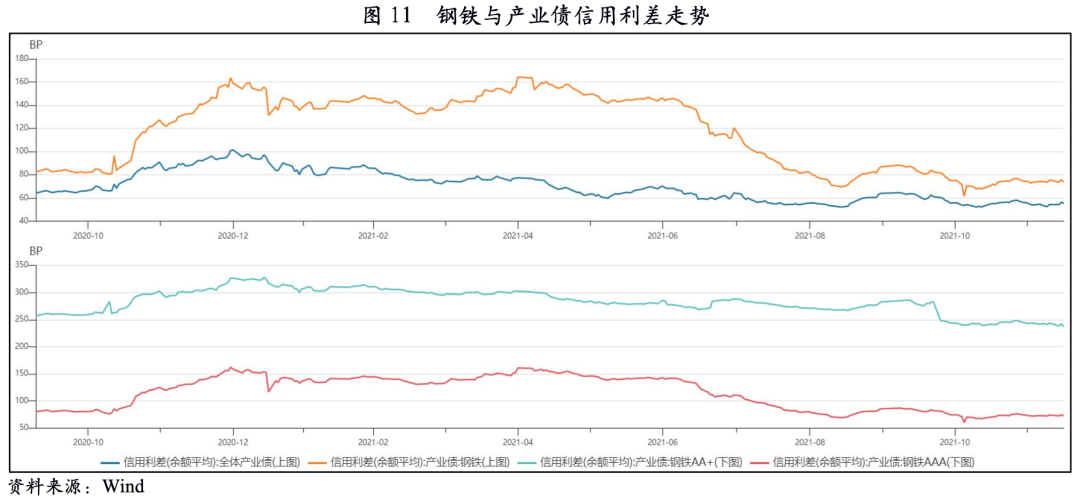 從發(fā)行成本來看,2021年初,由于鐵礦石價(jià)格大幅上漲,以及永煤違約事件引發(fā)的對(duì)強(qiáng)周期行業(yè)信用風(fēng)險(xiǎn)的擔(dān)憂,鋼鐵行業(yè)信用利差持續(xù)走擴(kuò)。但二季度以來,隨著鋼鐵企業(yè)收入和利潤(rùn)規(guī)模大幅增長(zhǎng),行業(yè)信用利差不斷收窄,且AAA鋼鐵債券信用利差降幅更為明顯。
