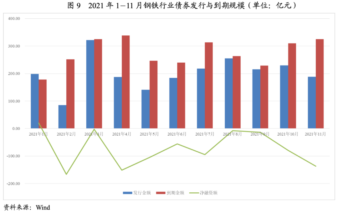 2021年以來,受益于經(jīng)營(yíng)效益向好,鋼鐵企業(yè)發(fā)債規(guī)模同比下降,債券凈融資規(guī)模持續(xù)為負(fù),且下半年信用利差明顯改善;2022年到期的鋼鐵債券規(guī)模不大,行業(yè)整體償債壓力較小。