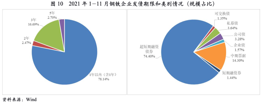 從發(fā)債期限和類型來看,2021年1―11月,鋼鐵企業(yè)發(fā)行的146只債券中期限在1年以內(nèi)(含一年)的債券共109只,發(fā)行規(guī)模占78.14%,整體債券發(fā)行期限偏短;鋼鐵企業(yè)發(fā)行的債券類型較為豐富,銀行間市場(chǎng)產(chǎn)品規(guī)模占比高。