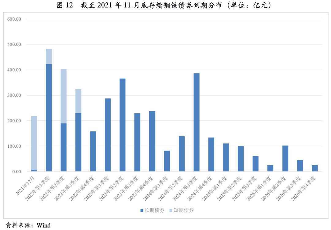 截至2021年11月底,鋼鐵企業(yè)存續(xù)債券余額合計(jì)3913.44億元,涉及發(fā)行主體37家,其中AAA主體23家、AA+主體11家、AA主體3家;一年內(nèi)到期債券規(guī)模1531.62億元,其中短期債券占37.67%、長(zhǎng)期債券占62.33%,相較2021年以來新發(fā)債的規(guī)模尚可。考慮到鋼鐵企業(yè)發(fā)債以周轉(zhuǎn)為主,且發(fā)債企業(yè)主要為高信用等級(jí)的央企和地方國(guó)企,行業(yè)整體償債壓力較小。