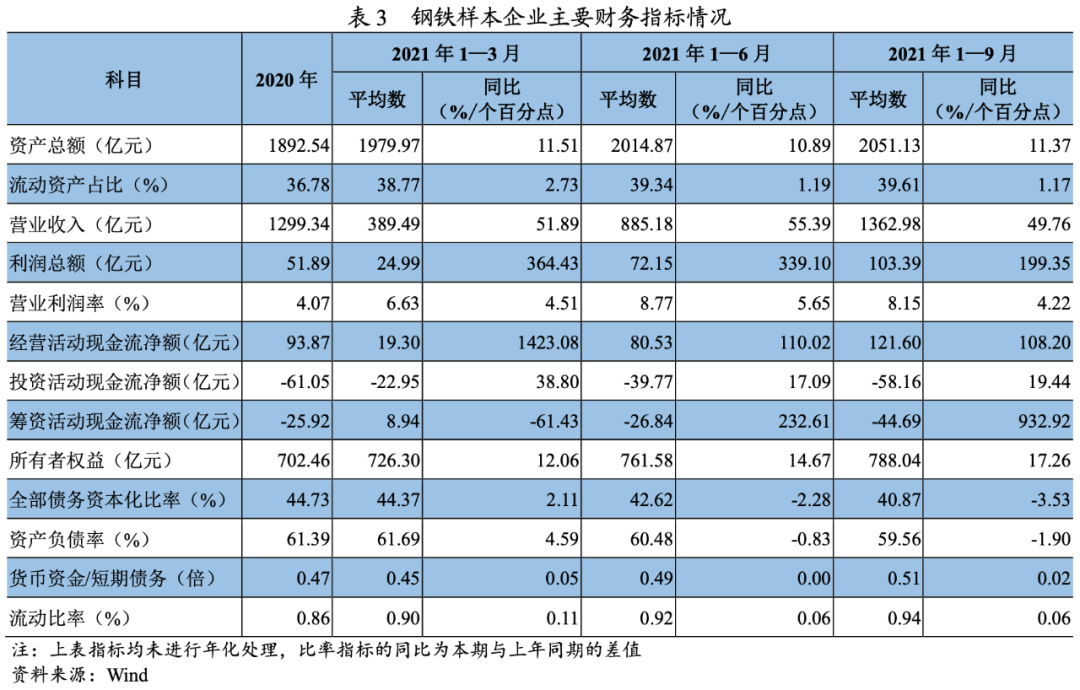 我們以截至2021年11月底有存續(xù)債券且財(cái)務(wù)數(shù)據(jù)可得的30家鋼鐵企業(yè)作為研究樣本(以下簡(jiǎn)稱“樣本企業(yè)”)。從財(cái)務(wù)指標(biāo)來看,2021年前三季度,樣本企業(yè)平均資產(chǎn)規(guī)模保持增長(zhǎng)趨勢(shì),流動(dòng)資產(chǎn)占比小幅提升;受益于行業(yè)景氣度高漲,樣本企業(yè)的營(yíng)業(yè)收入和利潤(rùn)總額均同比大幅增長(zhǎng),其中二季度的營(yíng)業(yè)利潤(rùn)率最高,與行業(yè)情況表現(xiàn)一致;現(xiàn)金流方面,經(jīng)營(yíng)活動(dòng)現(xiàn)金流凈額同比大幅增長(zhǎng),投資活動(dòng)和籌資活動(dòng)凈流出規(guī)模有所擴(kuò)大,經(jīng)營(yíng)活動(dòng)所得現(xiàn)金可滿足投資和籌資活動(dòng)支出,行業(yè)現(xiàn)金流狀況良好;債務(wù)負(fù)擔(dān)不斷下降,償債能力得到增強(qiáng)。