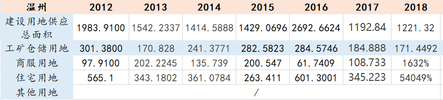 表4(2012年-2018年溫州建設(shè)用地一級市場供應(yīng)數(shù)據(jù)明細)數(shù)據(jù)來源:溫州市國土資源局/中國自然資源部/溫州市統(tǒng)計局(單位:公頃)