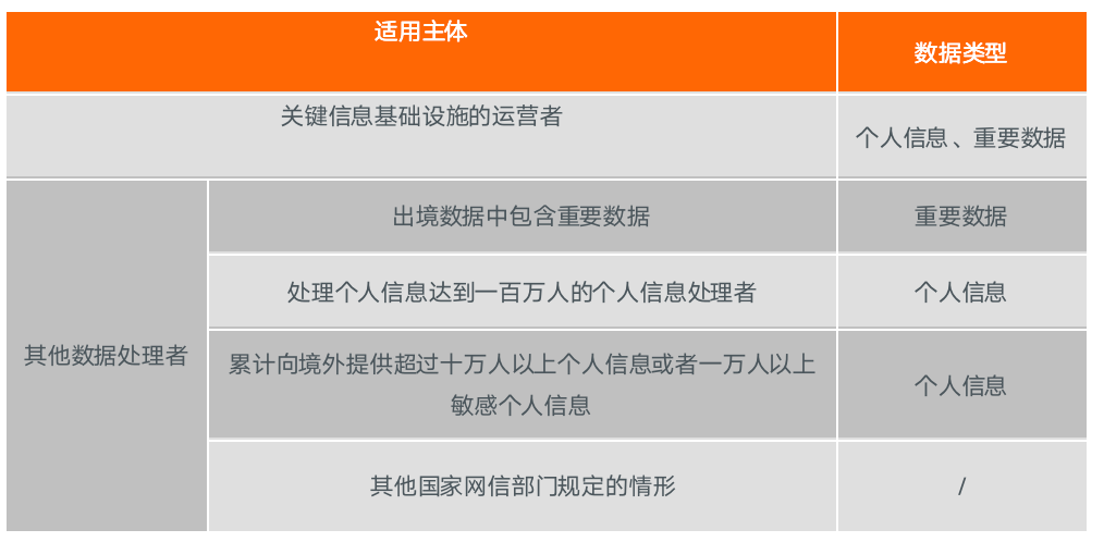 這意味著對于其他數據處理者而言,只要出境數據中包含重要數據,就需要進行安全評估;在處理個人信息時,一旦滿足“處理個人信息達到一百萬人”或“累計向境外提供超過十萬人以上個人信息或者一萬人以上敏感個人信息”這兩項,就需要進行安全評估。