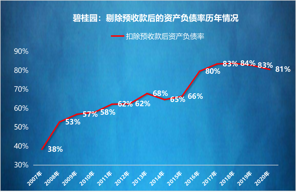 2016年之前,碧桂園剔除預(yù)收款后的資產(chǎn)負(fù)債率維持在70%以內(nèi)。2016年開始,增加到80%以上,并且一直維持。