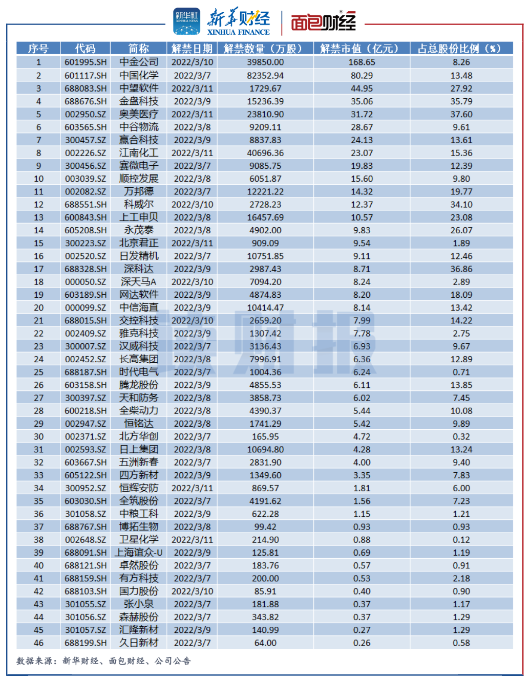 中金公司、中國化學、中望軟件為解禁市值前三名;奧美醫(yī)療、深科達及金盤科技為解禁占比前三名。其中,中國化學為定增配售股,其余均為首發(fā)原股東限售股。
