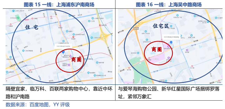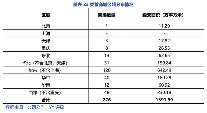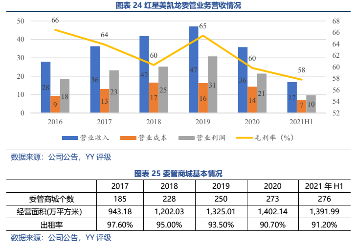 從經(jīng)營表現(xiàn)來看:1)自營業(yè)務(wù)收入穩(wěn)定,自持商場分布于一二線核心城市,但整體來說,坪效走向下坡,回報率逐年下降。2)委管業(yè)務(wù)資金占用小,有一定的利潤貢獻(xiàn),但未挑起大梁,且被質(zhì)疑“假委管”,存在表外負(fù)債及隱性經(jīng)營兜底的風(fēng)險;3)公司預(yù)打造新增長點——零售及家裝業(yè)務(wù),但尚處于發(fā)展期,當(dāng)前利潤貢獻(xiàn)仍十分有限,且還需持續(xù)投入資金。