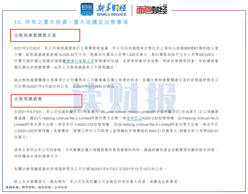 此外,根據(jù)海通恒信2021年年報,該公司當(dāng)年發(fā)生兩次重大的出售事項(xiàng),一次是向海通證券出售辦公室大樓,一次是出售2架飛機(jī),上述資產(chǎn)的評估價值分別為14.35億元和5.34億元。