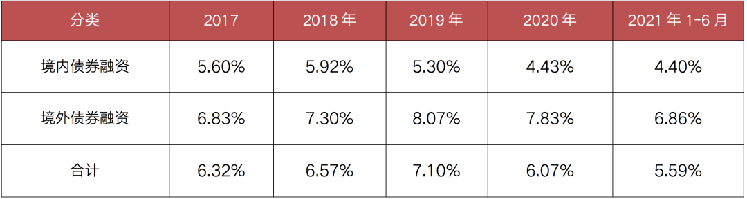 截至2021年6月,100家典型房企新增債券類(lèi)融資成本為5.59%,較2020年下降0.48個(gè)百分點(diǎn),其中境外債券融資成本達(dá)6.86%,下降0.97個(gè)百分點(diǎn),境內(nèi)債券融資成本4.40%,較2020年下降0.03個(gè)百分點(diǎn)。