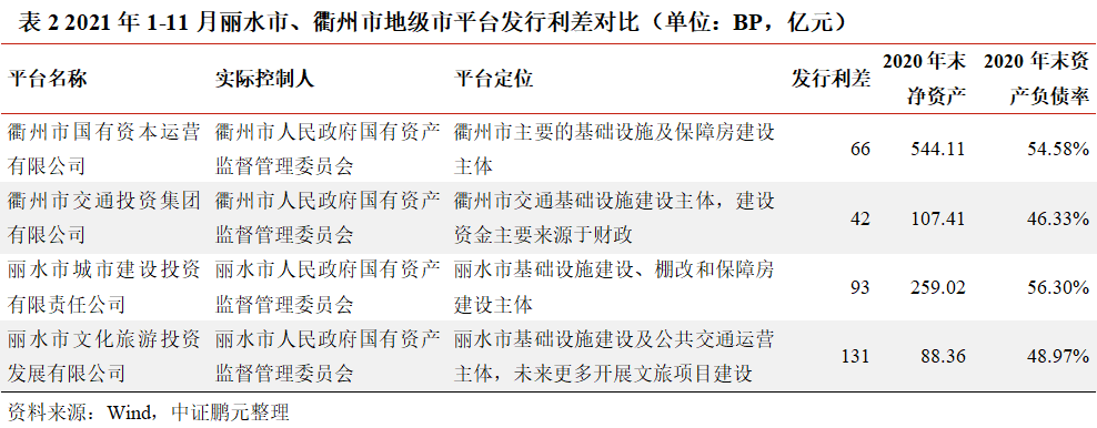 湖州市、麗水市經(jīng)濟(jì)財(cái)政實(shí)力在省內(nèi)排名靠后,且湖州市全口徑債務(wù)率高,各行政層級(jí)城投債發(fā)行利差位于省內(nèi)高位。麗水市雖然經(jīng)濟(jì)財(cái)政債務(wù)指標(biāo)與衢州市類似,但發(fā)行利差顯著高于衢州市,主要是因?yàn)閰^(qū)域內(nèi)發(fā)債平臺(tái)資質(zhì)相差較大,衢州國資、衢州交投和麗水市城市建設(shè)投資有限責(zé)任公司(以下簡(jiǎn)稱“麗水城投”)均為區(qū)域內(nèi)主要平臺(tái),但麗水城投相較于衢州國資而言凈資產(chǎn)規(guī)模較小,且債務(wù)壓力顯著高于衢州交投,麗水市文化旅游投資發(fā)展有限公司定位逐步向文旅方向轉(zhuǎn)型,非區(qū)域內(nèi)主要平臺(tái)。
