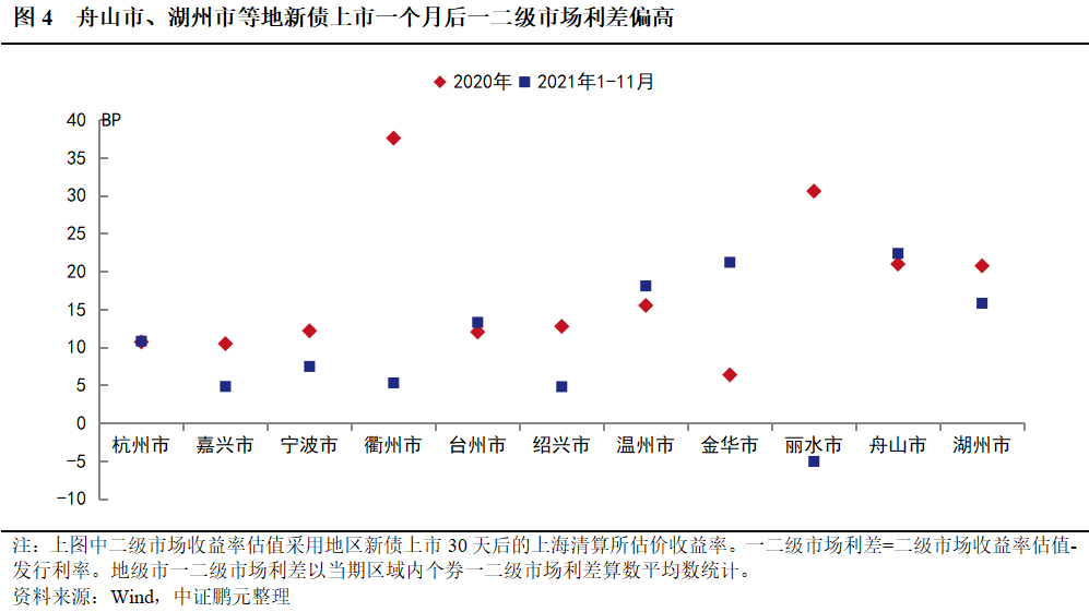 (3)新債上市一個(gè)月后,浙江省內(nèi)各地級(jí)市城投債二級(jí)市場(chǎng)收益率估值基本高于發(fā)行利率。舟山市、湖州市等地二級(jí)市場(chǎng)收益率估值較發(fā)行利率的偏離度相對(duì)較高,二級(jí)市場(chǎng)投資者要求回報(bào)提高。