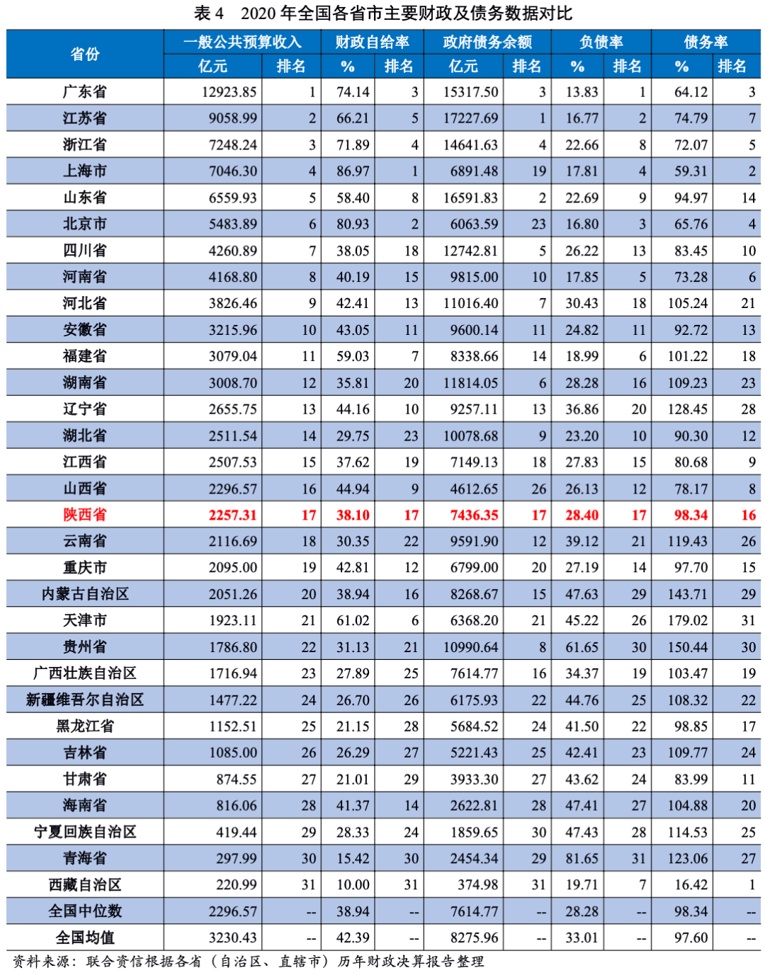 2020年,陜西省一般預算收入維持全國中游水平,但受新冠肺炎疫情、減稅降費和經濟下行等因素影響,陜西省一般公共預算收入有所下滑,財政自給程度持續減弱,對上級補助收入較為依賴。陜西省政府債務余額持續增長,2020年末排名全國第17位,政府債務率與負債率均處于全國中游水平,政府債務風險可控。