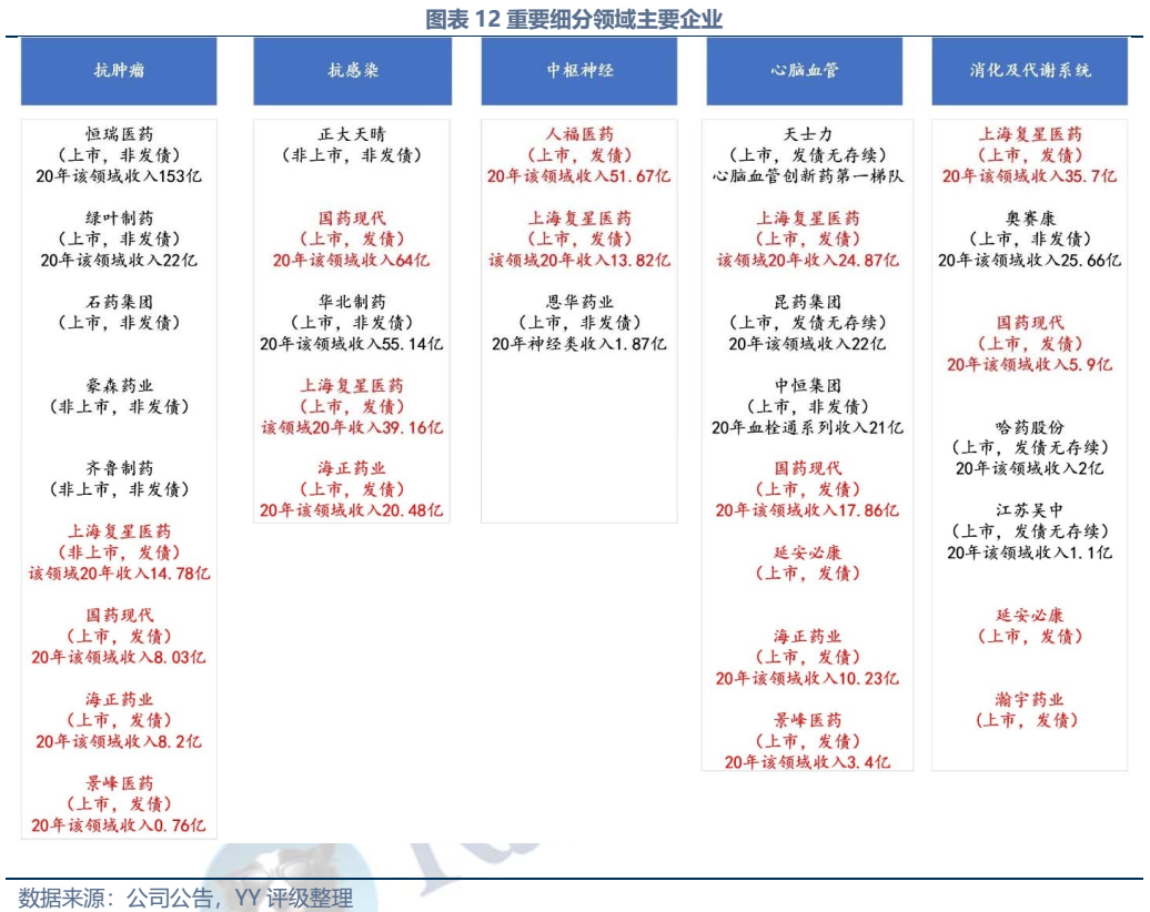 目前國內(nèi)醫(yī)藥市場仍主要以包括化學(xué)藥劑和生物藥在內(nèi)的西藥為主導(dǎo),且大部分以仿制藥為主。創(chuàng)新藥研發(fā)方面主要形成四大集群,不過整體在債市的存在感不高。競爭格局方面,抗腫瘤、抗感染、心血管、中樞神經(jīng)以及消化代謝系統(tǒng)領(lǐng)域占藥品市場規(guī)模60%以上,各領(lǐng)域企業(yè)眾多,具備一定市場地位的公司多為上市公司,如抗腫瘤領(lǐng)域主要有恒瑞醫(yī)藥、綠葉制藥、石藥集團、泰森制藥,抗感染領(lǐng)域主要有正大天晴、國藥現(xiàn)代、華北制藥、復(fù)星醫(yī)藥、海正藥業(yè)。