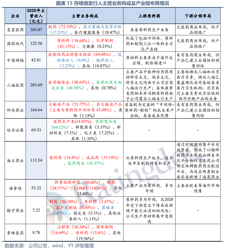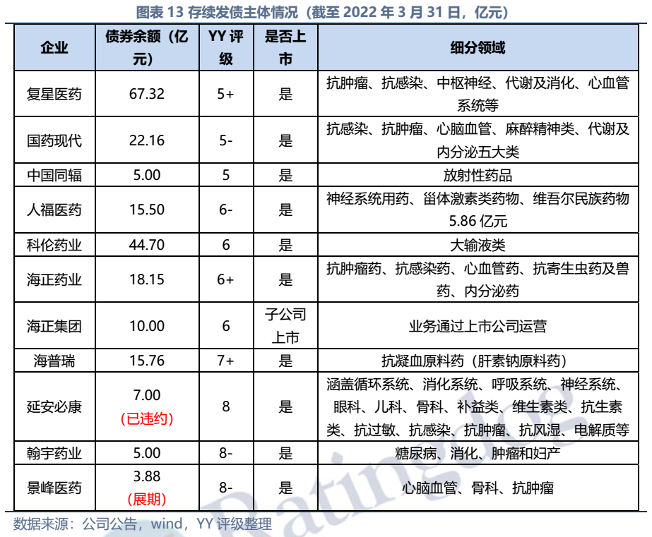 截至2022年3月末西藥行業(yè)發(fā)債主體存續(xù)債券余額僅214億元,存續(xù)債主體11家(含已違約的延安必康、已展期的景峰醫(yī)藥),具體來看:復(fù)星醫(yī)藥、國藥現(xiàn)代、人福醫(yī)藥、海正藥業(yè)、延安必康、翰宇藥業(yè)和景峰藥業(yè)擁有較多樣化的產(chǎn)品布局,復(fù)星醫(yī)藥(在抗感染、中樞神經(jīng)和消化系統(tǒng))、國藥現(xiàn)代(在抗感染、心腦血管)和人福醫(yī)藥(在心腦血管)具備較高的行業(yè)地位,中國同輻、科倫藥業(yè)和海普瑞產(chǎn)品則多聚焦于某一細分領(lǐng)域。財務(wù)方面,整體銷售毛利率較高(平均約50%),但銷售費用對利潤侵蝕較大(銷售費用/營收平均30%),存續(xù)發(fā)行人中除延安必康、景峰醫(yī)藥和翰宇藥業(yè)凈利潤出現(xiàn)虧損外,其他表現(xiàn)尚可;資產(chǎn)及負債方面,復(fù)星醫(yī)藥總資產(chǎn)顯著高于其他企業(yè),規(guī)模優(yōu)勢顯著;海正集團本部杠桿率很高,需關(guān)注債務(wù)壓力;行業(yè)整體短債占比較高,存在一定流動性壓力。
