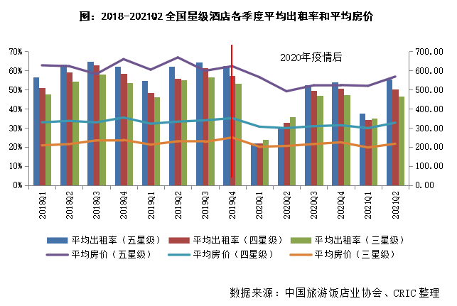 從中國旅游飯店業(yè)協(xié)會的數(shù)據(jù)來看,2018-2019年各季度全國五星級酒店平均出租率和平均房價分別為61%和622.5元/天,四星級酒店為57%和336.3元/天,三星級酒店為53%和226.5元/天。