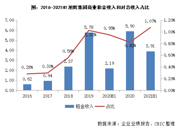旭輝商業(yè)近年來顯著加大了合作的力度,主要是因為其在2019年整合了旗下商業(yè)板塊之后,對于商業(yè)板塊的投入力度明顯加大,每年都會拿出集團(tuán)投資額的10%用于商業(yè)拓展,同時也提出“未來旭輝希望收入50%來自住宅開發(fā),30%來自租金收入,另外20%來自其他業(yè)務(wù)”,對商業(yè)地產(chǎn)領(lǐng)域的雄心可見一斑。但是當(dāng)前的旭輝商業(yè)仍處于起步階段,規(guī)模相對較小。截至2021年中期,旭輝商業(yè)共有9個商業(yè)綜合體在營,在營建面63萬平米,與行業(yè)前列的萬達(dá)、華潤、龍湖等企業(yè)仍有著不小的差距。相應(yīng)的,旭輝商業(yè)帶來的租金收入也相對較少,2021上半年旭輝商業(yè)板塊的租金收入約為3.91億元,同比增加78.5%,僅占集團(tuán)上半年總收入的1.07%。