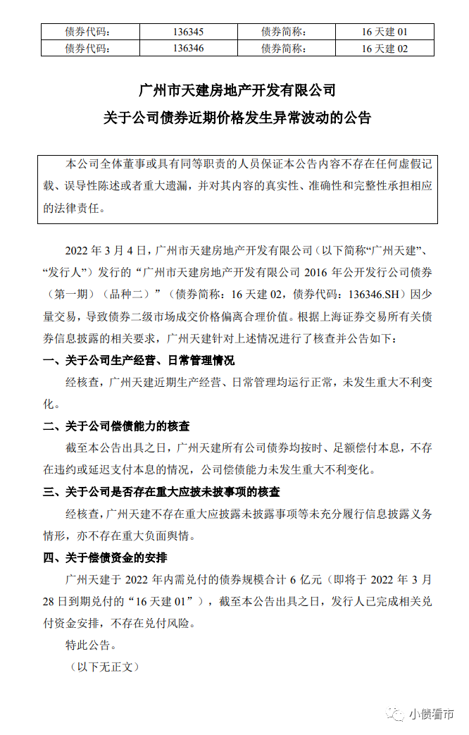 3月9日,廣州市天建房地產開發有限公司(以下簡稱“廣州天建”)公告稱,3月4日公司發行的“16天建02”因少量交易,導致債券二級市場成交價格偏離合理價值。