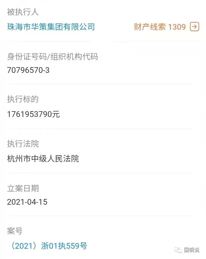 2021年4月15日,珠海市華策集團被納入執行人名單,執行標的約17.62億元